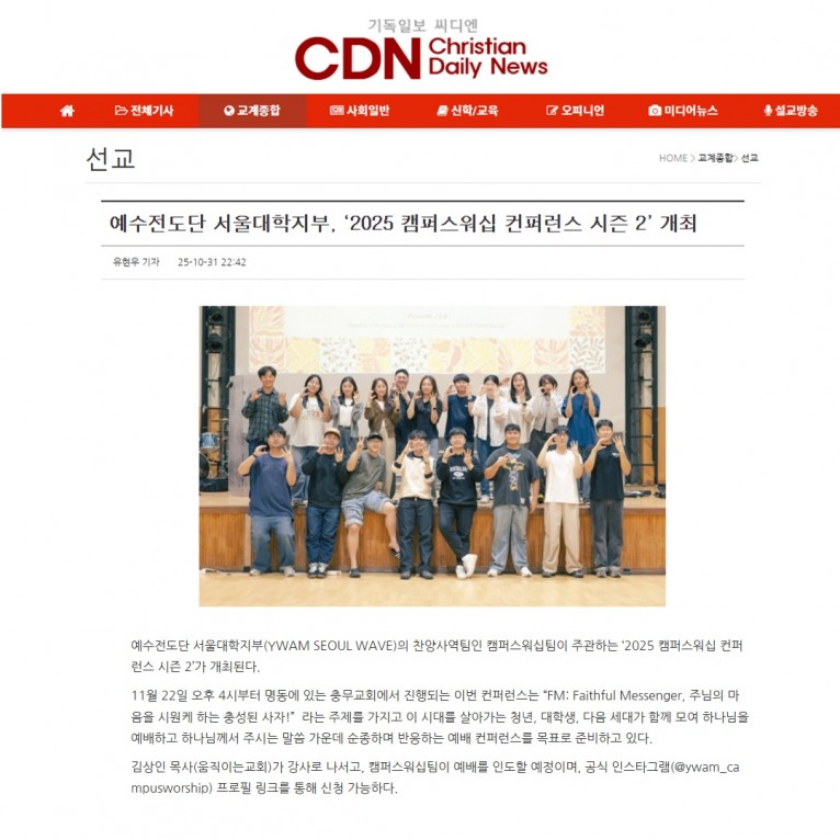 [기사] 예수전도단 서울대학지부, ‘2025 캠퍼스워십 컨퍼런스 시즌 2’ 개최(기독일보 씨디엔)