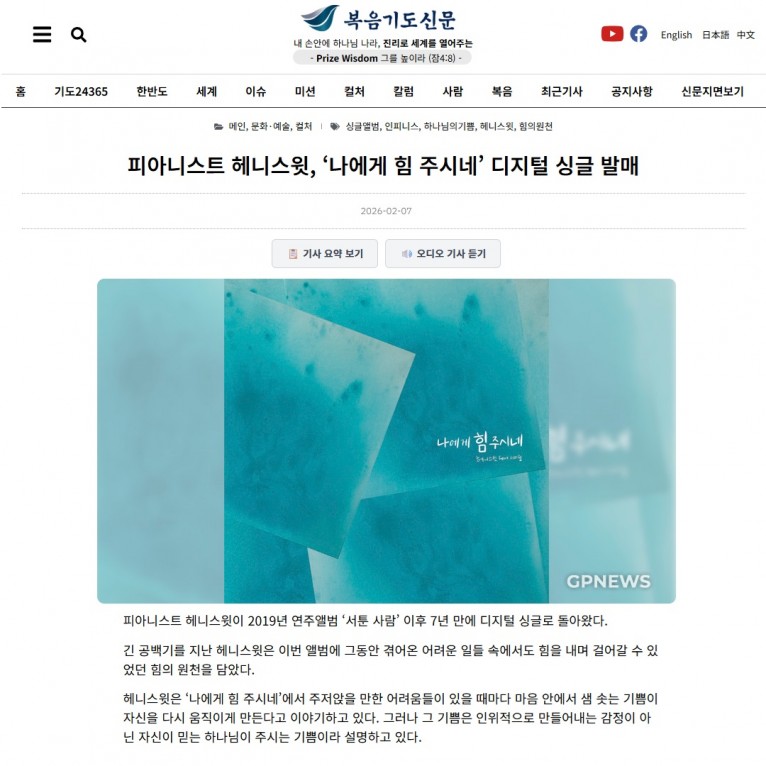 [기사] 피아니스트 헤니스윗, ‘나에게 힘 주시네’ 디지털 싱글 발매(복음기도신문)