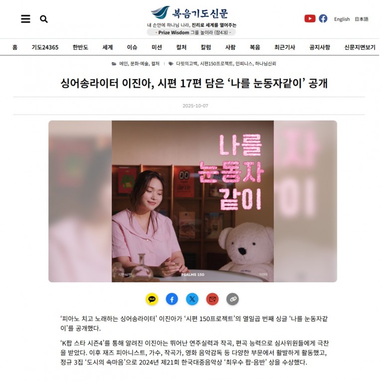 [기사] 싱어송라이터 이진아, 시편 17편 담은 ‘나를 눈동자같이’ 공개(복음기도신문)