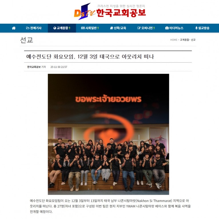 [기사] 예수전도단 화요모임, 12월 3일 태국으로 아웃리치 떠나(한국교회공보)